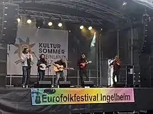 El Pony Pisador is a musical group from Barcelona that mixes various styles of folk and traditional music from around the world, including Celtic music, sea songs (sea shanties and habaneras), bluegrass, tarantella and yodel.[1] The band's name refers to the J.R.R. Tolkien's The Lord of the Rings inn The Prancing Pony, called «El Pony Pisador» in the Spanish translation.