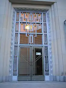 The building is an impressive five-story structure, creating the illusion of a solid limestone mass rising to a height of 94 feet. It is designed in the Art Moderne style, incorporating classical elements. A steel and concrete structure faced with limestone veneer, each elevation adheres to classical principles of symmetry and articulation by a regular rhythm of bays with a centralized principal entrance. Art Moderne elements are embodied by the sharp angles and zigzag surfaces seen in the stacked fenestration of the upper stories, and in the geometric, low-relief abstraction of the ornamentation.[2]