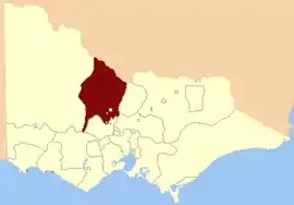Its area was defined in the Victoria Constitution Act of 1855 as: "Bounded on the West by the River Avoca, from its Source in the great dividing Range to its Entrance to Lake Bael Bael, thence by a Line Northward to the River Murray ; on the North by the River Murray ; on the East by the River Campaspe to its Junction with the Coliban, and on the South by the Northern Boundary of the Counties of Dalhousie and Talbot to the commencing Point, excepting the Country comprised in the Electoral Districts of the Castlemaine Boroughs and of the Sandhurst Boroughs."[3]