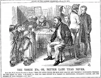 The Elementary Education Act 1870,[4] commonly known as Forster's Education Act, set the framework for schooling of all children between the ages of 5 and 12 in England and Wales.[5] It established local education authorities with defined powers, authorized public money to improve existing schools, and tried to frame conditions attached to this aid so as to earn the goodwill of managers. It has long been seen as a milestone in educational development, but recent commentators have stressed that it brought neither free nor compulsory education, and its importance has thus tended to be diminished rather than increased.[6]