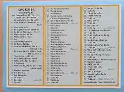 Here is the English translation of the most popular sung text in Chinese speaking countries and in Vietnam , realized from the romanized Sanskrit (or IAST) Amogavajra's version[lower-alpha 7]. The numbers in brackets have been added, as the sentences (or verses) in the original are not numbered[lower-alpha 8]: