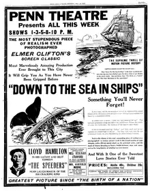 In 1921, local buildings in the Dartmouth and New Bedford areas—including the Apponegansett Meeting House and the Elihu Akin House—appeared in the film Down to the Sea in Ships. In the film, the Akin House was described as the "Old Homestead", and a scene shows the house's rear entry.[2] The film provides the only known photographic evidence of there having been a barn and a shed at the house at that time (today, a thirty-foot one-story shed stands behind the house[7]); the film also serves as a visual aid that highlights the house's early-twentieth-century landscaping, showing details such as a wall and a gate on the back-side property line.[8][11]