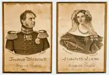 On 29 November 1823, she married the future King Frederick William IV of Prussia[3] and supported his intellectual interests, namely his attempts at artwork, which he held dear to his heart. She refused to become a Protestant as a condition of her marriage, insisting that she would only convert if she was convinced on the merits of the reformed faith after studying it for herself.[4] It was on 5 May 1830, seven years after her marriage, that Elisabeth formally converted to Protestantism.[5] Her union was reportedly happy, but remained childless: after a single miscarriage in 1828, Elisabeth was unable to have any offspring.[6]
