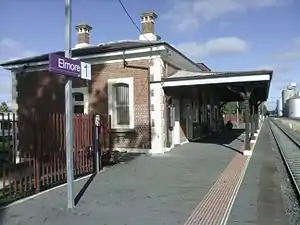 Elmore railway station is located on the Deniliquin line in Victoria, Australia. It serves the town of Elmore, and it opened on 19 September 1864 as Runnymede. It was renamed Elmore on 1 November 1876.[2]