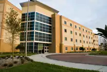 Over 1,000 students take up residence on campus in the $29 million Student Village residence complex on the north edge of campus. Four residence halls, as well as two food venues, housing offices, and the office of the Embry Riddle Resident Student Association, are contained within the Student Village. The ResNet (Residential Network) support office for student-owned computers is also located there.[9] The residence halls in the Student Village are Adams Hall, Wood Hall, O'Connor Hall and Stimpson Hall. Adams and Wood are both freshmen halls. Two residents reside in each room, and two rooms adjoin to form a suite with a shared bathroom.[10][11] O'Connor provides apartment-style living for upperclassmen residents. In O'Connor, two residents share a room, and four rooms form a suite for a total of 8 residents per suite. Occupants of a suite share two bathrooms, a common room and a kitchen area.[12] Stimpson provides apartment-style living for upperclassman as well. There are two variations of rooms in Stimpson. One style has a very large room and one smaller room. The other style has two similar moderate-sized rooms and a smaller room. Both of these styles accommodate two residents and have a bathroom and kitchen area.[13]