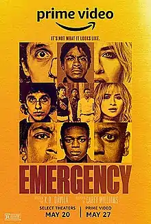 Emergency is a 2022 American thriller comedy-drama film directed by Carey Williams and written by K.D. Dávila, based on their 2018 short film of the same name. It stars RJ Cyler, Donald Elise Watkins, and Sebastian Chacon as three college students who must weigh the pros and cons of calling the police when faced with an unexpected situation.