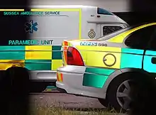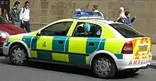 A British paramedic fly-car vehicle with high visibility Battenburg colour scheme, popular in the UK