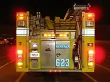 An American fire engine lit up at night. Notice the use of lights and reflective markings on the vehicle.