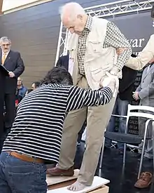Aguirre leaving his footprint in the "Bulevar del Calzado" in Arnedo, in 2008.