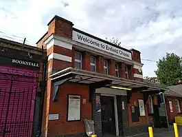 The original Enfield Station in Windmill Hill opened on 1 April 1871 as the terminus for the Great Northern Railway branch line from Alexandra Palace. By 1887, 37 trains a day left Enfield, mainly for King's Cross, but also to Broad Street and until 1907, to Woolwich and Victoria.[3] The station building was a two-storey twin-gabled house, similar in style to the single-storey building at Palmers Green. It was sited lengthways across the end of the track. The single island platform was covered by a wide canopy for much of its length. Enfield Station had been intended to bring prosperous middle-class commuters to the area. A journalist visiting the station in 1885, saw a sign advertising cheap workmen's tickets for trains scheduled to arrive in London before 8 am, only to find that the timetable showed that there were no trains that met that criterion.[4] The old Enfield Station closed to passengers in 1910 and was replaced by the present station, but remained in use as a goods depot until 1974. The surviving buildings were demolished and replaced in the 2000s with housing along a new street, Gladbeck Way.[5]