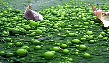 Clothing often contains non-organic, excessively farmed cotton which is grown with chemicals that are known to cause eutrophication. Eutrophication is a process in which fresh water sources such as lakes and rivers become overly enriched with nutrients. This causes a dense growth of plant life that is harmful to the ecosystem, such as algae blooms. Algal blooms deplete levels of oxygen in water as they decompose, resulting in changes to the ecosystem, either through the die-off of aquatic creatures or populations moving as water becomes uninhabitable. Algal blooms can also make bodies of water unsuitable for both human consumption and recreation.[49] Two of the main ingredients in pesticides are nitrates and phosphates, and when pesticides leak into stream systems surrounding the cropland via runoff, the nitrates and phosphates contribute to water eutrophication.