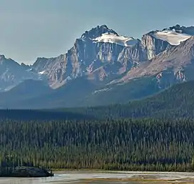Epaulette Mountain is located in Banff National Park and is visible from the Icefields Parkway. It is part of the Waputik Mountains, a subrange of the Canadian Rockies. The nearest higher peak is Mount Sarbach, 3.64 km (2.26 mi) to the northwest.[2] Epaulette Mountain is situated south of Saskatchewan Crossing, where the Icefields Parkway intersects with the David Thompson Highway. Precipitation runoff from Epaulette Mountain drains east into the Mistaya River and west into Howse River, which are both tributaries of the North Saskatchewan River. Topographic relief is significant as the summit rises 1,600 meters (5,250 feet) above the Howse Valley in three kilometers (1.9 miles), and 1,400 meters (4,593 feet) above the Mistaya Valley in three kilometers.