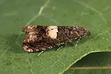 The wingspan is 15–20 mm (0.59–0.79 in).[2] Forewings show a subquadrate large whitish dorsal blotch and a light brown colouration.[3] These moths are very similar to Epiblema scutulana and Epiblema cirsiana,[2][4] but they are generally browner and lighter.[2]