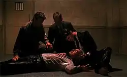 Inside the interrogation room, BOB confesses—through Leland's body—that he murdered Theresa Banks, Laura Palmer and Maddy Ferguson. When Cooper, Albert, Sheriff Truman and Hawk leave, BOB chants a poem ending with the phrase "fire, walk with me."[7] The water sprinklers turn on and BOB forces Leland to commit suicide by ramming his head into a steel door. BOB vacates Leland's body and Leland, in his dying moments, reveals the nature of his possession. Cooper comforts Leland through his last moments and Leland dies after seeing a vision of Laura.