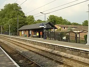 The letters LMS can still be seen on the adjacent road bridge.[2] At the foot of the ramp to the southbound platform there is a sculpture by Ronald Rae entitled Insect and Celtic Cross.[3]