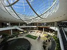 Erin Mills Town Centre was built on a land that had been accumulated by E. P. Taylor's "Don Mills Developments" in 1954.[2] The mall opened in 1989 and was owned and managed by Cadillac Fairview until it was purchased by the Ontario Pension Board in 2010 for $370 million (CAD).[3] Excavation for the mall was started in 1987, and completed in 1989. There was a large clock tower at the centre of the mall, though this was replaced with a glass sphere during the (CAD) $100 million redevelopment.[4] A Cineplex Odeon movie theatre was closed in 2000 and was replaced by Old Navy and Sport Chek stores. In addition, there was a daycare which was converted to retail space in 2005. The mall also had a mini-golf course located in the centre court, but it was converted into an upscale café. In 2008, a plaza outside the mall, but on the mall grounds was built. The plaza consisted of Indigo Books, LCBO, and more. There was also an older plaza located on mall grounds (which was previously a Loblaws grocery store opened in 1992) which consisted of Dollarama, Home Sense, Menchies, and also a salon.[5]