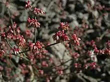 This buckwheat is an annual herb growing up to a meter in height with a slender flowering stem. The round woolly leaves are located about the base of the stem. The inflorescence is a series of branches lined with smaller branches bearing many small clusters of tiny white, pink, or reddish flowers.