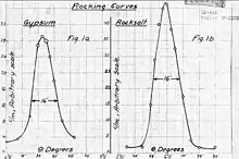 Hand-plotted rocking curves for Bragg scattering from single sodium chloride (salt) crystals at the X-10 reactor at Oak Ridge, obtained by Ernest O. Wollan and Lyle B. Borst in December 1944.