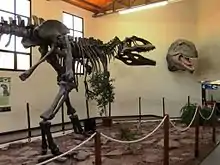 The paleontological exhibition has reconstructions and original fossils of different extinct species. There is a reconstruction mounted on the articulated skeleton, and original remains of Giganotosaurus carolinii. Mounted reconstructions of Neuquensaurus australis and Amargasaurus cazaui, and a cast of the head and neck of Bajadasaurus pronuspinax are also exhibited. Besides, there are a replica of a vertebra of Argentinosaurus huinculensis and the original femur of an unspecified titanosaur. Moreover, there is a replica of the mounted skeleton of Carnotaurus sastrei and Skorpiovenator bustingorryi. This last species is exhibited in the same way as it was found at the excavation site. Apart from the species Carnotaurus, there are original caudal and dorsal vertebrae, metarcapus and maxilla of the sauropod Choconsaurus baileywillisi, whose specific name comes from the locality where it was found. In addition to dinosaurs, original materials of Prochelidella sp., Kaikaifilusaurus calvoi and Avitabatrachus uliana, and the replica of Araripesuchus patagonicus are exhibited.[10]
