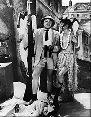 He also developed such routines as an all-gorilla version of Swan Lake, a poker game set to Beethoven's Fifth Symphony, the skit Silent Show, in which Eugene interacts with the world accompanied solely by music and sound effects, parodies of typical television commercials and movie genres, and various musical segments with everyday items (such as kitchen appliances or office equipment) moving in sync to music.[54][55] A popular recurring skit was The Nairobi Trio, three derby-hatted apes (Kovacs, his wife, Edie Adams in gorilla suits; and frequently, the third ape was Kovacs' best friend Jack Lemmon) miming mechanically and rhythmically to the tune of Robert Maxwell's "Solfeggio".[56][57]