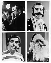 Kovacs being made up (upper left) for the U.S. Steel Hour "Private Eye-Private Eye" (1961) in which he played many of his usual characters as well as a butler (upper r), a skin diver (lower l), and Santa Claus.