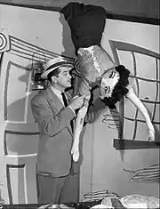 Kovacs and Adams met in 1951 when she was hired to work for his WPTZ show, Three to Get Ready.[34] Her appearance on Arthur Godfrey's Talent Scouts caught the eye of Kovacs's producer, and he asked her to audition for the program. A classically trained singer, she was able to perform only three popular songs. Edie said later, "I sang them all during the audition, and if they had asked to hear another, I never would have made it."[9][125] Quoting Kovacs, "I wish I could say I was the big shot that hired her, but it was my show in name only – the producer had all the say. Later on I did have something to say and I said it: 'Let's get married.'"[14][18]