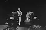 Barbara Loden and Kovacs positioned in front of two television cameras for illusion.