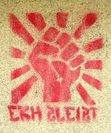 In 2004, the owner of the house (the Communist Party of Austria) sold the EKH to a real estate company, and the residents were threatened with eviction since the new owner was a former right wing extremist.[1] After a long struggle with many protests and actions, a company with close contacts to the municipality of Vienna bought the building in July 2005.[2] The threat of eviction passed and in 2008, a rental contract was signed.[1]