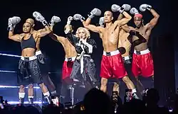 Four 2023–24's The Celebration Tour, "Erotica" was given a boxing theme. The stage had a ring crafted from lasers, while Madonna―who donned a slip dress underneath a boxing robe―cavorted around shirtless dancers wearing glittery gloves.[120][121][122] The performance ended with the singer masturbating on a red velvet, flanked by a drag queen dressed in the Jean Paul Gaultier-designed gold corset from 1990's Blond Ambition World Tour.[121] From the BBC News, Mark Savage saw the number as "a reminder of her tumultuous relationships", as the backdrop screens depicted Madonna's current boyfriend, boxing coach Josh Popper.[123]