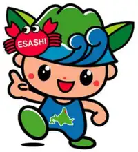 Esashi's mascot is Esashi-kun (えさっしー). He is a bright and energetic fairy who loves the forest and the sea and the taste of the horsehair crab. As such, he customized his hat with the things he likes. He is unveiled in 2011. He is created by Ayumi Shozaki of Osaka.[11][12]