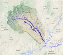 The Escalante River is a tributary of the Colorado River. It is formed by the confluence of Upper Valley and Birch Creeks near the town of Escalante in south-central Utah, and from there flows southeast for approximately 90 mi (140 km) before joining Lake Powell. Its watershed includes the high forested slopes of the Aquarius Plateau, the east slope of the Kaiparowits Plateau, and the high desert north of Lake Powell. It was the last river of its size to be discovered in the 48 contiguous U.S. states.[1] The average discharge is approximately 146 cfs (4.1 m³/s).