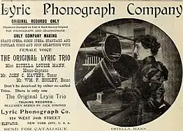 In early 1898 she and her singing partner John C. Havens formed the Lyric Phonograph Company. The company showcased records of the Lyric Trio (of Mann, Havens, and bass William F. Hooley) singing opera, comic opera and concert solos, duets and trios. By September of the same year, the company had begun shipping records abroad, had begun recording other artists such as Joseph Weber and Jack Simonds,[3] and had opened a branch office in San Francisco. The company moved to an expanded headquarters in early 1899 and added band, violin, organ, mandolin and other types of records to their catalog throughout the year.