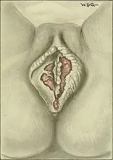 Esthiomene is generally the visible result of lymphogranuloma venereum, lymphatic infection by Chlamydia trachomatis. This sexually transmitted infection produces inflammation of the lymphatic channels in the female genitalia, followed by abscesses, fistulae, ulcerations, and fibrosis of the tissues. The tissues swell, sometimes severely, and the genitalia may grow to a massive size.[1] Esthiomene can also be the result of tuberculosis when the infection takes hold in the genitalia,[4] or of cancer or filariasis, infection with parasitic roundworms.[2]