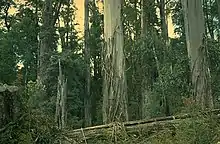 Eucalyptus brookeriana, commonly known as Brooker's gum,[3] is a tree species that is endemic to south-eastern Australia. It has rough, fibrous bark on the lower part of its trunk, smooth bark higher up, lance-shaped, egg-shaped or curved adult leaves, flower buds usually arranged in groups of seven, white flowers and cup-shaped, conical or bell-shaped fruit.