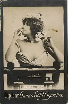 Fougère was also an early example of a pin-up model; she appeared on many postcards and on a trading card for the cigarette brand Ogden's Guinea Gold Cigarettes. While in Paris from 1894–1897, the American painter Louis Kronberg made a portrait of Fougère (Dancer With Tambourine).[62]