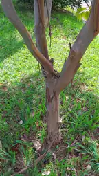 The adult tree is 3–6 m tall,[3] with rounded or conical canopy up to 2 m wide. New leaves are rusty-brown, turning yellow and then deep dark green. The reddish-brown bark peels off naturally showing a smooth reddish trunk. Leaves are simple, in opposite pairs, with smooth leathery texture, smooth edges, and the apex curved downwards.