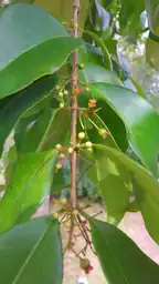 Fruits mature between February and March. The ripe fruit is a round or slightly elongated berry, up to 20 mm wide and 25 mm long. It has a thin purple-black skin and a wet, firm, whitish pulp about 3–5 mm thick, surrounding a loose single (rarely double) seed. It is edible, moderately sweet, with an aroma similar to (but less intense than) that of the jabuticaba.[4]