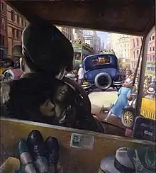 When in 1931 McEvoy contributed a painting called Cuban Village to Society of Independent Artists exhibition at Grand Central Galleries, New York, a critic described it as "red roofs surrounded by tropical greenage, extremely well painted."[10] The following year she put works in an exhibit sponsored by Salons of America[11][note 7] and when she exhibited at the Salons the following year she showed her 1928 painting, Lenox 2300, now renamed Taxi! Taxi!. This time the painting drew the attention of critics for both the New York Sun and New York Times. The Sun's Henry McBride said it gave a "cinematic version of congested street traffic", rising above the quality of other works in the show, though "laboriously expressed."[13] Edward Alden Jewell, in the Times, praised the painting for "the amazing skill with which technical difficulties have been tossed off by this artist" adding "not often does one encounter such sang froid at that.[14] The painting's point of view is that of an unenthusiastic woman passenger who is permitting a male companion to nuzzle her neck. The two can be seen reflected in the glass screen that divides the front of the cab from the back. The driver's head is seen from behind and his image shows on his cab license on the back of the front seat. The viewer sees the hats of the cab's passengers and their intertwined feet. Through the cab's front and side windows can be seen a street crowded with pedestrians and traffic, including two autos comically teetering. The fare shown on the meter is high, suggesting a lengthy and unhurried trip.[note 8] McEvoy exhibited this painting at an exhibition held by the Woodstock Art Association later in 1933,[16] in 1949 at a solo exhibition at Town House in Woodstock,[17] and again in 1956 at the Woodstock Museum of Art (where it drew comment as "Eugenie McEvoy's renowned canvas.")[18]