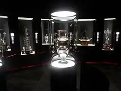 The three consecutive European Cup trophies won by Bayern Munich, 1974–76. The one on the far right is the real trophy, given to Bayern permanently in 1976. The ones on the left are slightly smaller replicas.