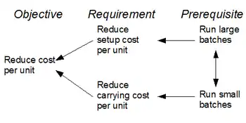 Goldratt has illustrated the use of the evaporating cloud technique in a discussion of the Economic production quantity model.[9]:43 The prerequisite wants are to run large batches (D) and yet to run small batches (D’). These are clearly in conflict. The required need that D is trying to meet is to reduce setup cost (B), whereas the D’ prerequisite needs to reduce carrying cost per unit (C). Both requirements are aimed at the objective (A): to reduce cost per unit.