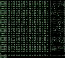 A hex dump of an executable real mode loader. The first column consists of addresses of the first byte in the second column, which comprises bytes of data in hexadecimal notation (least significant byte first), and the last column consists of the corresponding ASCII form.[1]