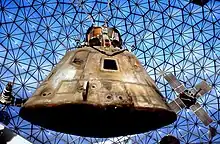 • United States of America Pavilion - designed by Buckminster Fuller, the pavilion was the third most popular, with over 9 million visits. The building was distinguished by its large 20-story geodesic dome with an acrylic skin (which would catch fire and melt away in 1976). The Expo 67 minirail train passed through the building. Designed by Cambridge Seven Associates, the six levels of exhibits, connected by escalators, were based on the theme of: "Creative America - the positive use of creative energy". The exhibits included everything from American Folk Art and Elvis Presley's guitar to NASA’s Apollo Command Module and Lunar Excursion Module. But not everyone liked the pavilion, including US President Lyndon B. Johnson, who (after a brief visit) was alleged to have said "the homosexuals have had carte blanche!" in reference to the design and content of the displays. After Expo 67, the geodesic dome was repurposed to house the Biosphère.
