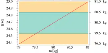 Consider the calculation of a person's body mass index (BMI). BMI is calculated as a person's body weight in kilograms divided by the square of their height in meters. Suppose a person uses a scale that has a precision of one kilogram, where intermediate values cannot be discerned, and the true weight is rounded to the nearest whole number. For example, 79.6 kg and 80.3kg are indistinguishable, as the scale can only display values to the nearest kilogram. It is unlikely that when the scale reads 80kg, the person has a weight of exactly 80.0kg. Thus, the scale displaying 80kg indicates a weight between 79.5kg and 80.5kg, or the interval .