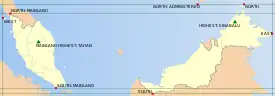 The following are the extreme physical land mass points on the Malaysian peninsula inclusive of islands.
