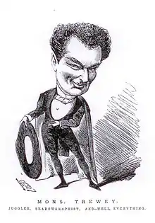 Félicien Trewey, born Félicien-François Trevey (23 May 1848 – 2 December 1920), was a French magician, mime, comedian, vaudevillian, tightrope walker, balance artist, dancer, musician, chapeaugraphist and shadowgraphist.[1][2] The principal of Trewey's entertainment was balancing tricks, which at the time he was a grand master.[3] He was a great card-thrower, scaling cards at great distances. He gave musical entertainment with instruments of his own invention. He had great skill in the uncommon art of writing any words selected by his audience backwards and was an exceptional lightning sketch artist. King Edward VII had witnessed Trewey on many occasions and the Emperor of Austria, Baron Rothschild, as well as many others, have on more than one occasion sent for him to come perform for them.[4] He has also played in several films directed by his good friend Louis Lumière of The Lumière Brothers, including Chapeaux a Transformations (1895), The Photographe (1895), Danseuses des rues (1896), and was uncredited in the 1895 film Partie de cartes ("Card Game"; US title: The Messers. Lumière at Cards).[5][6]