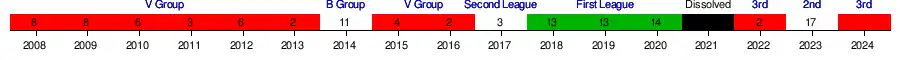 Green marks a season followed by promotion, red a season followed by relegation.