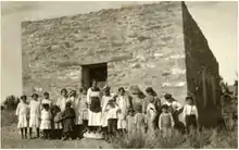 Fabiola Cabeza de Baca in front of a rural school in New Mexico, circa 1920s.