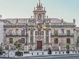 This façade is probably the most important baroque public building of Valladolid. It is made of stone brought from Campaspero and it is composed of two stories and gigantic columns, Corinthian capitals that produce the bow of the entablature. At the top, in the frontispiece, is the statue of the Wisdom, depicted as a matron walking over ignorance.