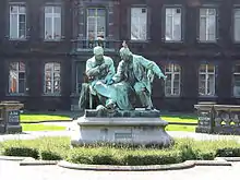 Ancient buildings of the FPMs (Faculté polytechnique de Mons) and statue of the founder, rue de Houdain.