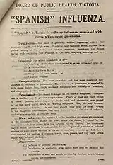 In 1918 Melbourne and Sydney's ports were placed under quarantine in an attempt to avoid the introduction into Australia of the Spanish Influenza epidemic which was claiming thousands of lives around the world.[6] While the quarantine had some effect in limiting the introduction of the disease to Australia, the first cases were eventually diagnosed and patients were hospitalised, causing a sharp rise in intake figures. Fairfield Hospital's intake of patients had remained stable until 1918–1920; during these years the intake jumped to 6000 patients a year, which would remain the average until the late 1980s.[3]